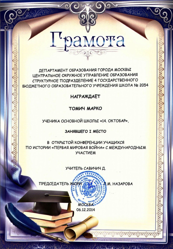На наградном конкурсу посвећеном великом рату, одржаном у МОСКВИ 6. ДЕЦЕМБРА 2014.године, ученик осмог разреданаше школе МАРКО ТОМИЋосвојио је ПРВО МЕСТО. Рад о историји овог краја у време окупације у Првом светском рату настао је у оквиру пројекта “ИСТРАЖИВАЊЕМ ДО ЗНАЊА”удружења наставника "ДОСИТЕЈ ОБРАДОВИЋ".